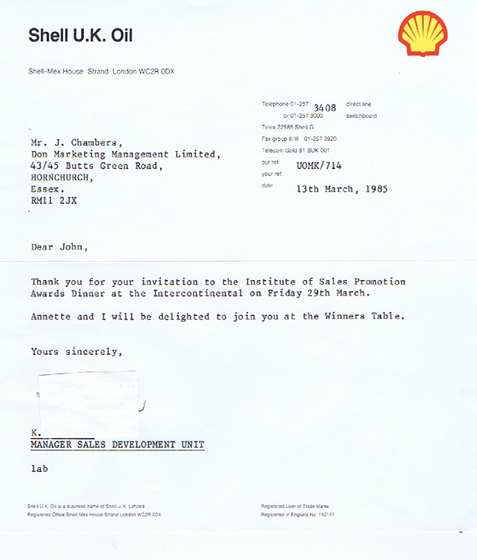 Related letter from Ken Danson, Manager Sales Development Unit for Shell U.K. Oil. Signature redacted for security reasons.